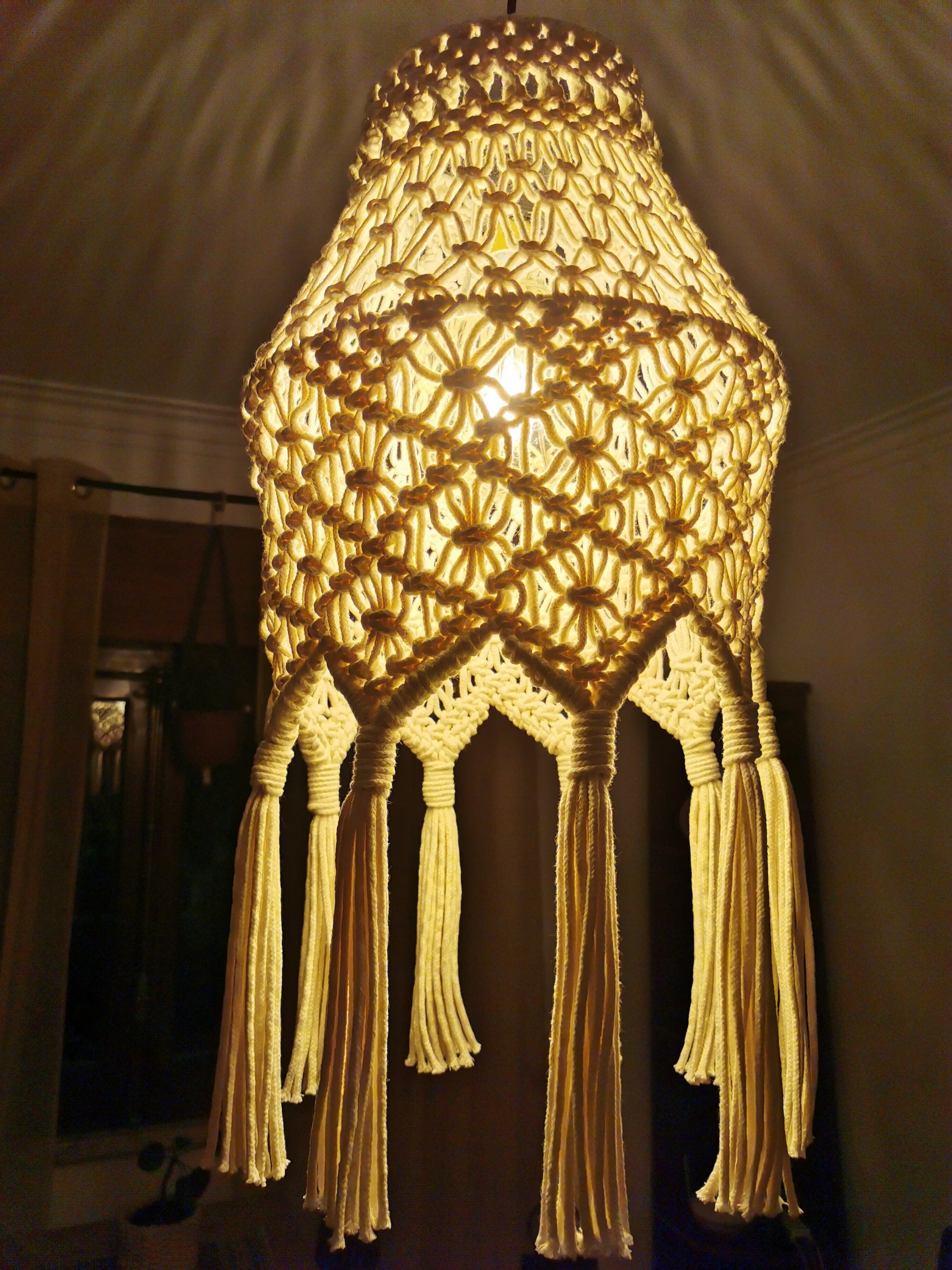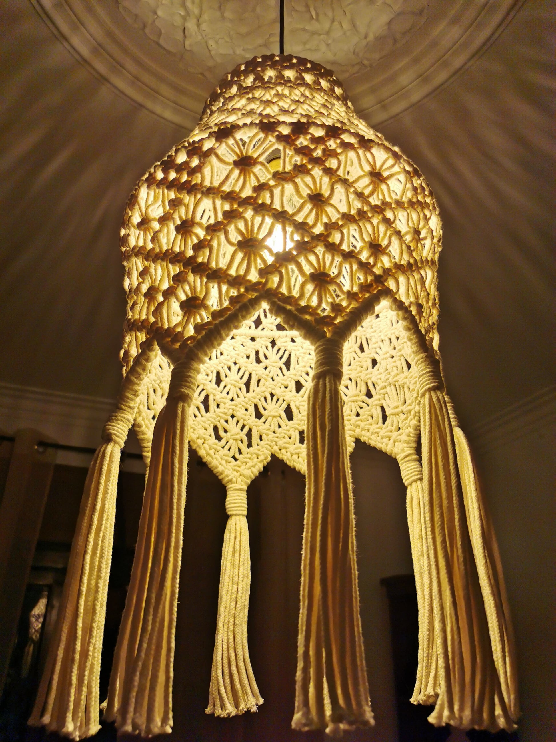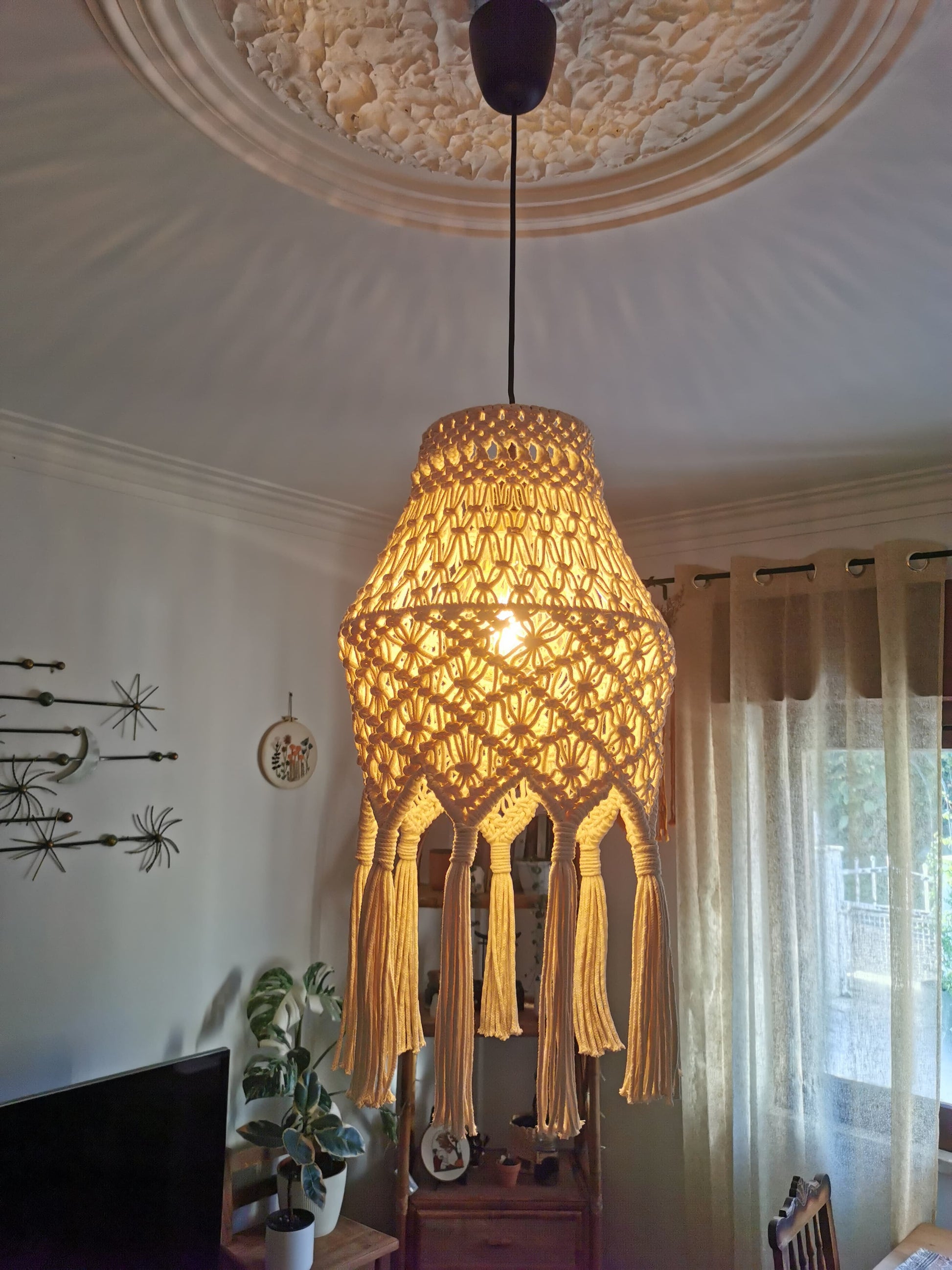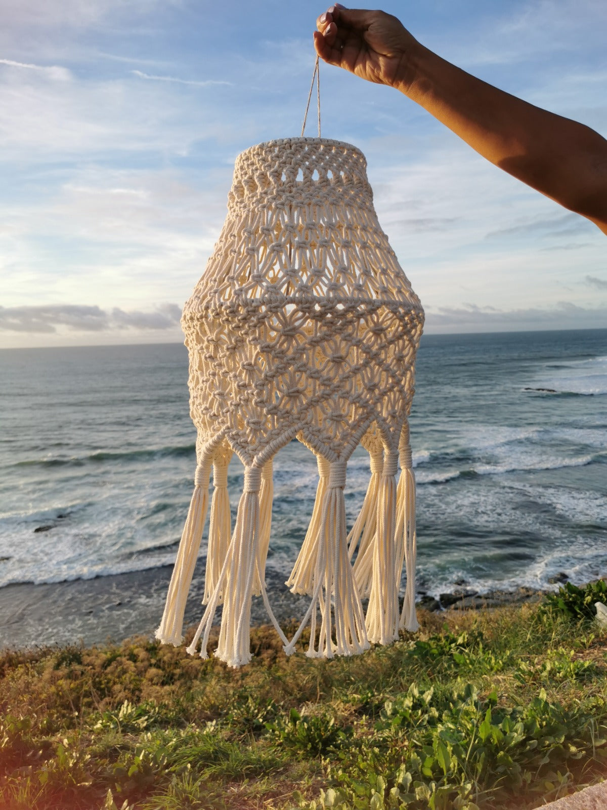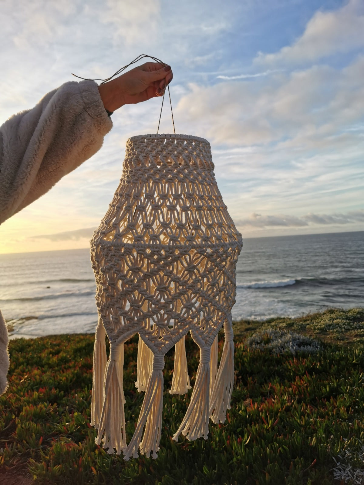 A arte do macramé, transmite encanto e delicadeza para transformar o seu espaço e este abajur é perfeito para a sua casa.